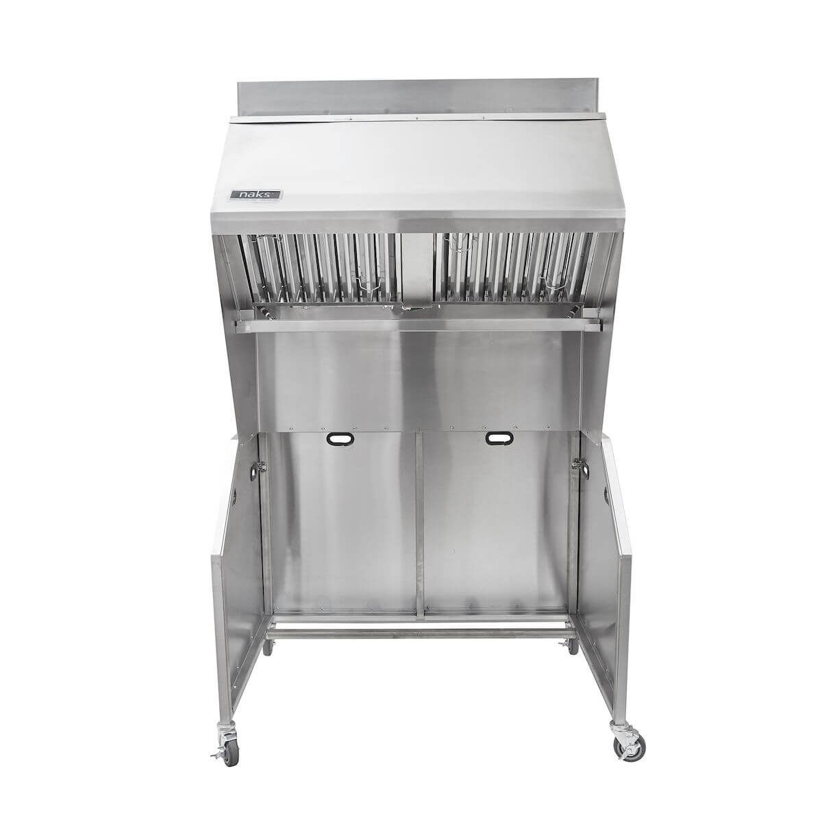 The NAKS Mobile Ventless Type 1 Hood System designed for use with electric equipment. The triple-filter system with updraft technology meets vapor removal requirements for a variety of food service applications incorporates a stainless-steel baffle filter to trap grease particles, wire mesh filter for air cleaning and condensation, with a disposable charcoal odor filter. (NOTE: Fire Suppression system is not included with this model).